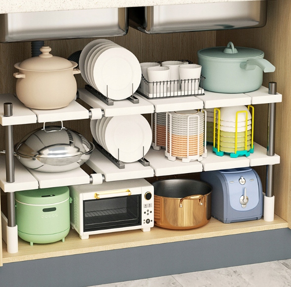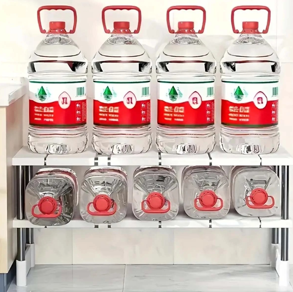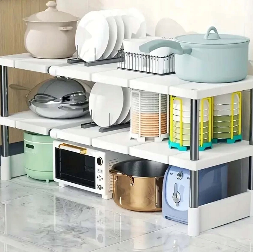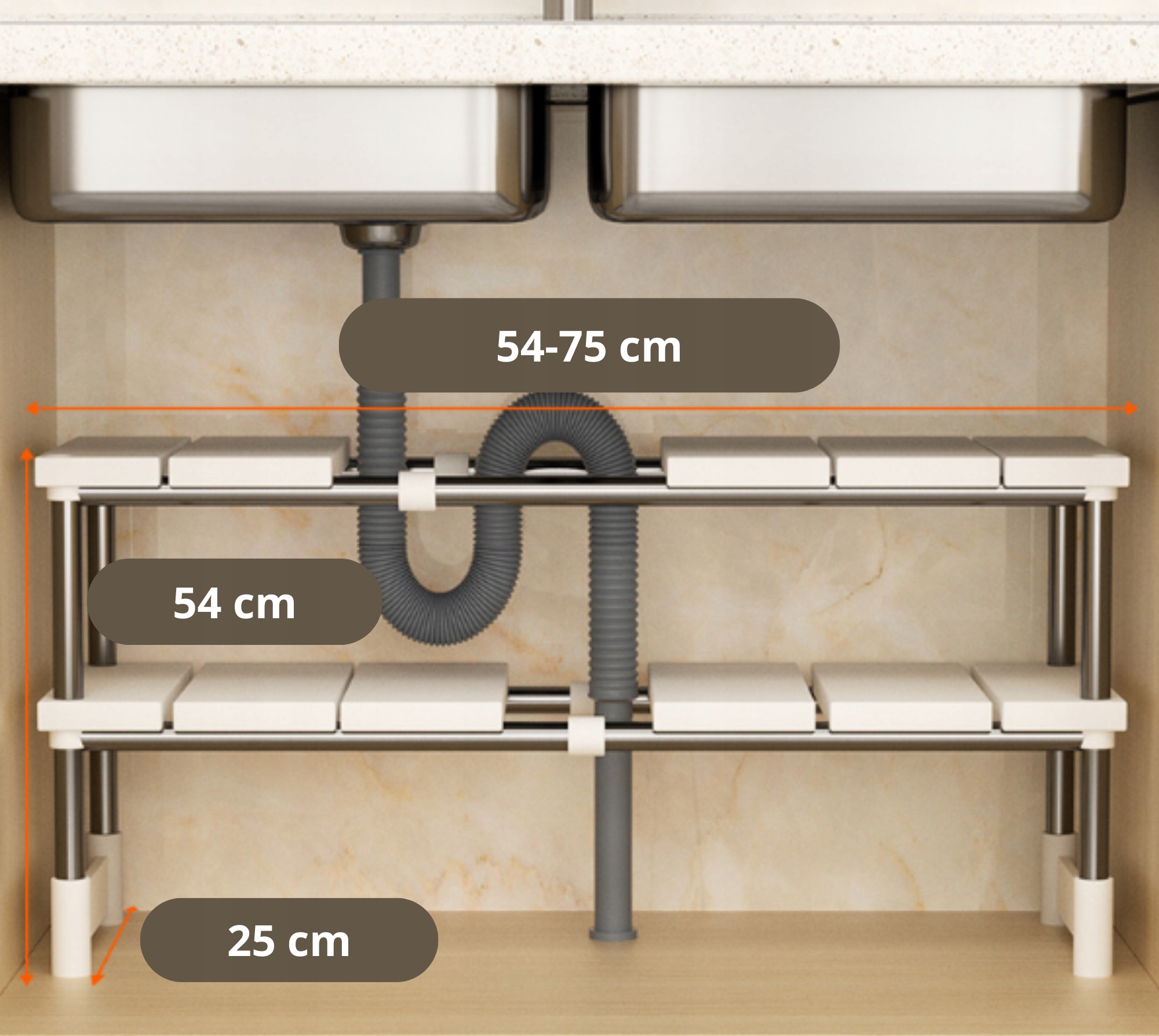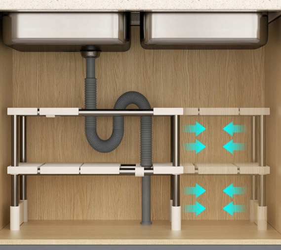 Rozsuwana konstrukcja pozwala łatwo dopasować półkę do wielkości szafki lub przestrzeni pod zlewem. Sprawdzi się w każdym wnętrzu – od małej kuchni po dużą łazienkę.
