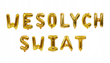- Balony foliowe w kolorze złotym, tworzące napis "WESOLYCH SWIAT" (bez polskich znaków)